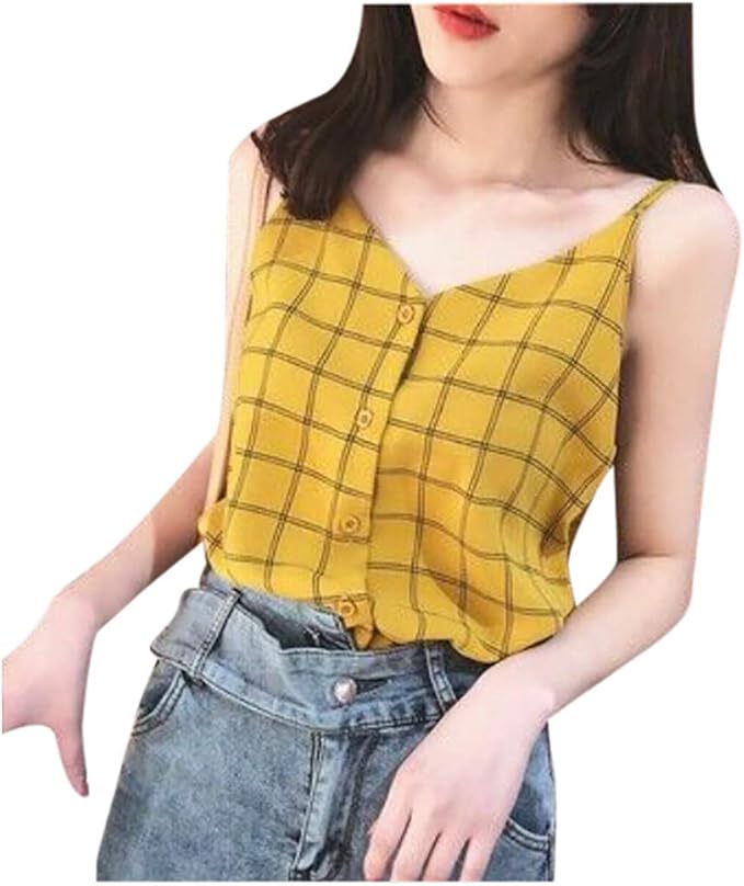 Amazon Vネックタンクトップ レディース キャミソール 夏 チェック柄ボタンルーズトップ キャミソールノースリーブ スリングスリムベストトップス カジュアルキャミベスト コンフォートノースリーブtシャツ イエロー キャミソール タンクトップ 通販