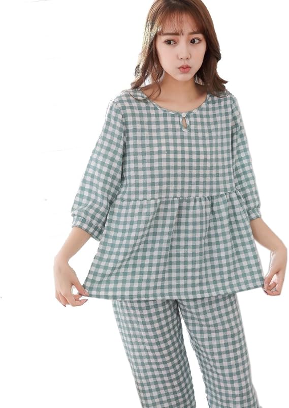 Amazon Doudai パジャマ ルームウェア レディース セットアップ 上下セット 部屋着 ナイトウェア 寝間着 寝巻き 半袖 ロングパンツ チェック柄 プルオーバー パフ袖 パフスリーブ リラックスウェア 春夏 パジャマ ルームウェアセット 通販